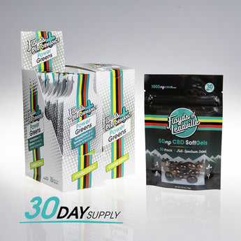 2 packages of PowerGreens + 50mg 30ct Full Spectrum SoftGels